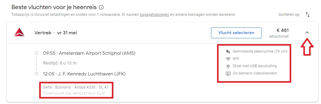 Voordat je een keuze maakt geeft Google je namelijk nog wat extra informatie. Zo zie je nu de volgende dingen over de geselecteerde vlucht: